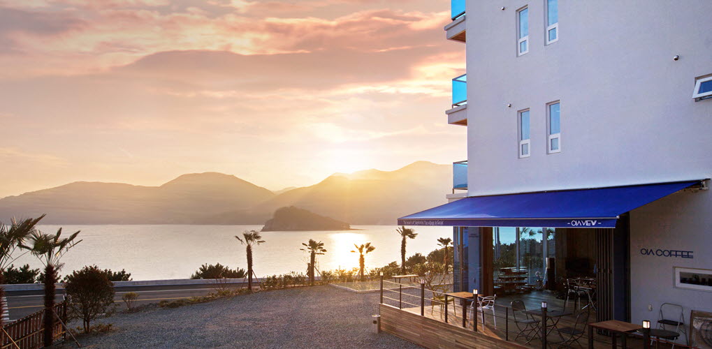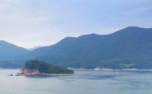 잔잔한 에메랄드 빛깔의 바다와 초록의 산속.