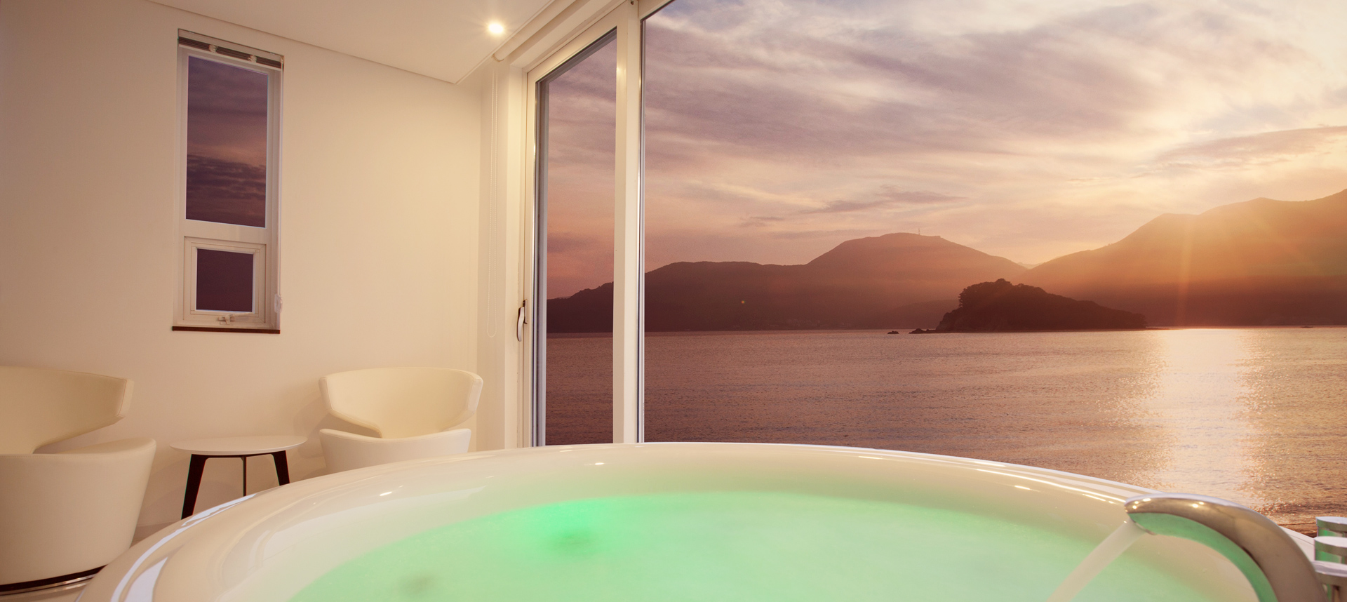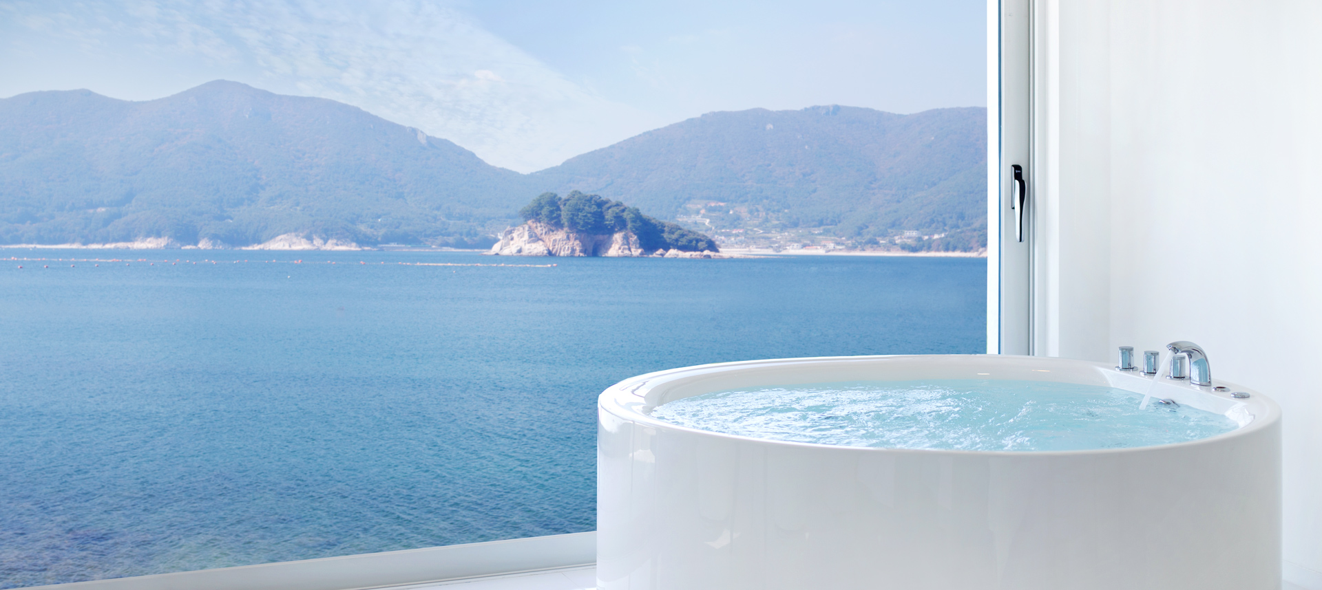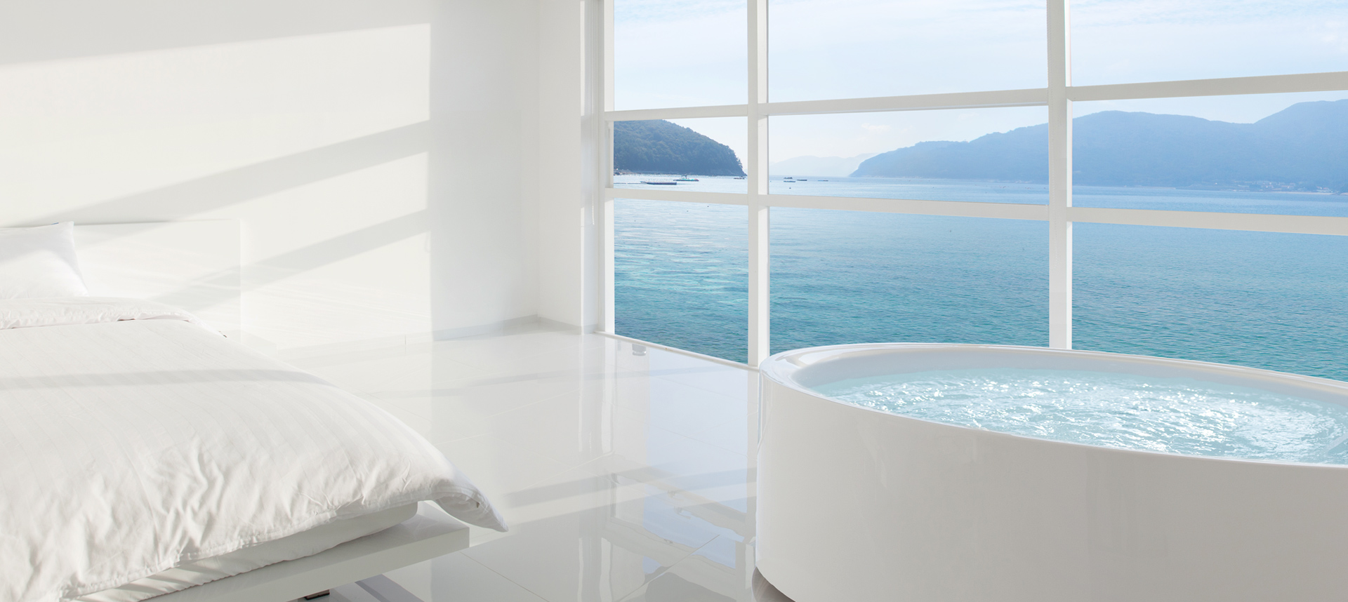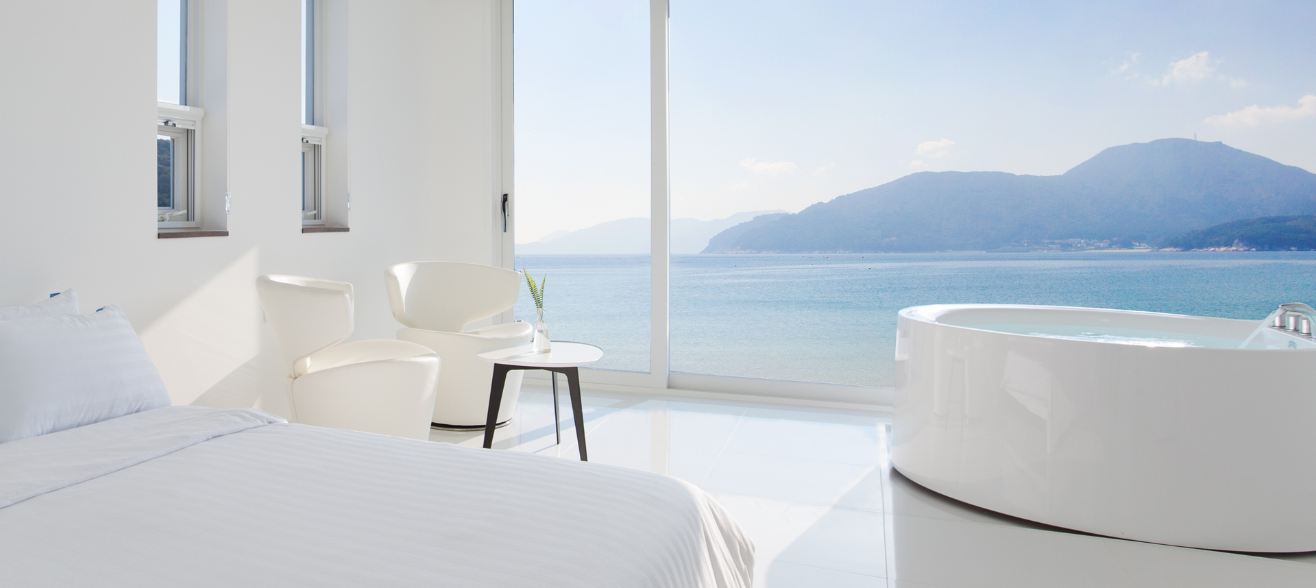 거제바다의 찬란한 자연 속에서 마주하는 진정한 휴식을 취할 수 있는 곳 이아뷰 이아뷰에 펼쳐지 이 곳이 세상에서 유일한 공간. 넓고 푸른 바다가 손끝에 닿을듯한 전객실 오션뷰 룸입니다. 월풀을 즐기며, 혹은 편하게 침대에 누워서거제도의 푸른바다, 빛나는 바다를 만끽하세요. 잔잔한 바다와 윤돌섬을 시원스럽게 내려다보는 이곳 이아뷰는 깔끔한 인테리어와 벽을 가득 채운 전면창이 매력적입니다.